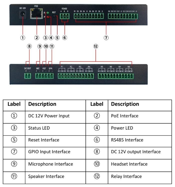 마이크 입력 1개, 헤드셋 출력 1개, 스피커 출력 1개, 릴레이 8개, GPIO 알람 입력 16개, DC 출력 1개, RS485 1개, 리셋 1개 |
